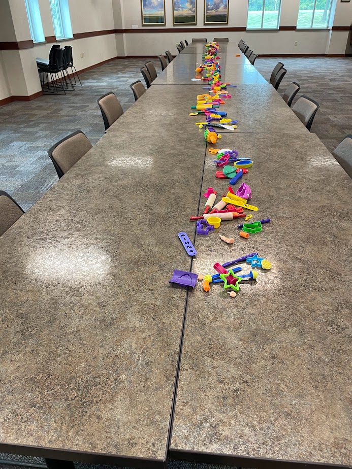 | Open Play | After we were done with the structured storytime, I released the kids and their adults for open play. I had tables out with a ton of play-doh tools.![]() |