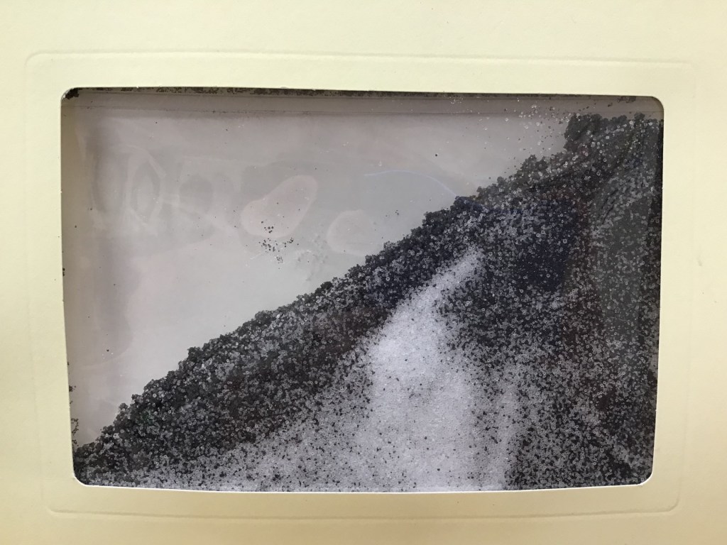 - Open the plastic sleeve and pour in half of the sand. Then, add the salt, followed by the remaining sand.